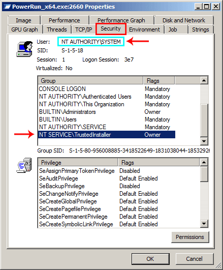 If that was true, then in ProcessExplorer, I would see the processes lauched by PowerRun as having the user: NT SERVICE\TrustedInstaller, but instead I see the processes launched by PowerRun having the user as: NT AUTHORITY\SYSTEM.