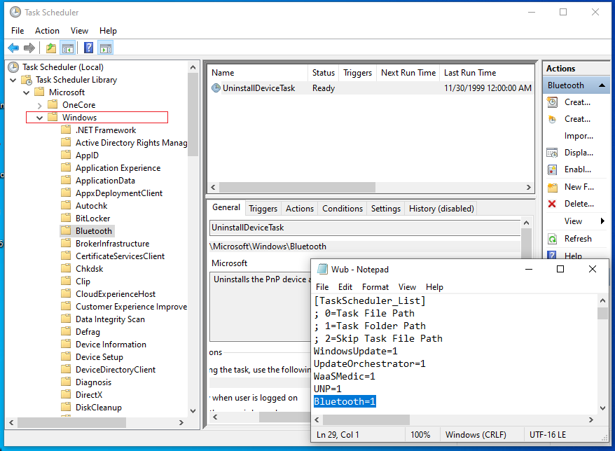 From “Wub.ini” file you can only disable under “\Microsoft\Windows\” folder tasks , for example, if we want to disable the “\Microsoft\Windows\Bluetooth\UninstallDeviceTask” task; add the “Bluetooth = 1” under the [TaskScheduler_List] line.
